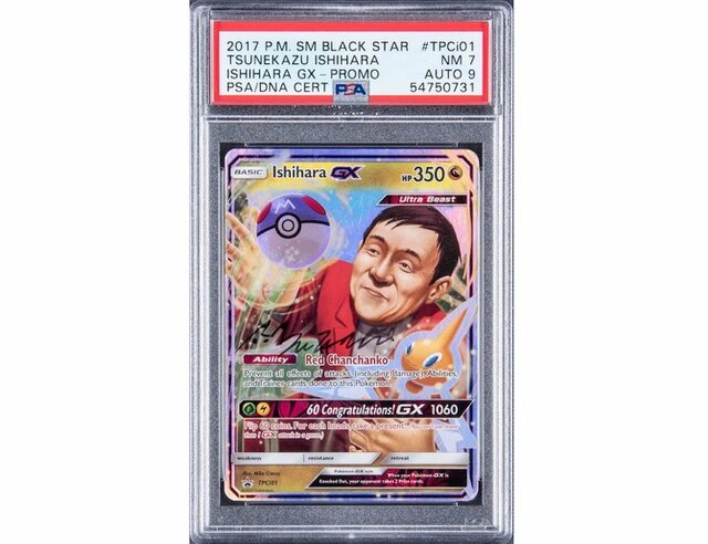 海外オークションサイトgoldin auctionによると、今回落札されたポケモンカードは、2017年に株式会社ポケモンの代表である石原恒和氏の60歳の誕生日を記念して作られたもので、社員にのみ配布されたとされています。赤いジャケット(アビリティは赤いチャンチャンコ)を着た石原氏がロトムとマスターボールを掲げた構図のカードには、黒いマジックで本人のサインも入っています。
